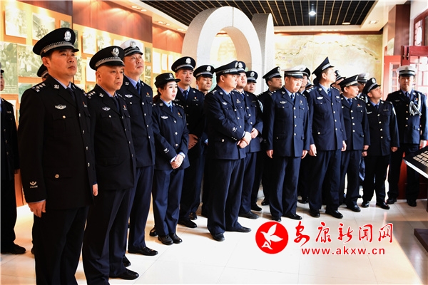 在巍然聳立的烈士紀念碑前,全體民警輔警整齊列隊、莊重肅立。民警代表首先向英雄烈士敬獻了花籃,全體人員脫帽肅立、鞠躬默哀,并依次上前瞻仰英雄烈士,通過回顧英雄事跡,表達對革命先烈的深切悼念和無限哀思。隨后,全體黨員同志站在烈士紀念碑前高舉右手,莊嚴宣誓,在鏗鏘誓言中重憶入黨入警初心、告慰英靈。