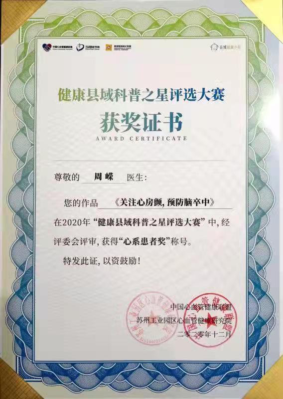 2020年 獲第二屆“互聯(lián)網(wǎng)+健康中國”科普大賽“科普達(dá)人獎”