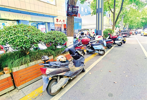 6月18日,在安康城區(qū)金州南路人行道上,部分車輛占用盲道、車身超出停車線(圖1),未按要求停放車輛(圖2),造成了安全隱患。(記者 張喬 攝)