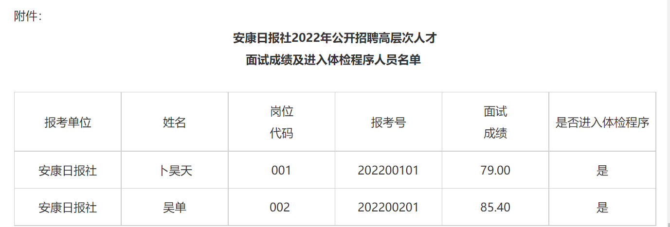 根據(jù)《安康日?qǐng)?bào)社2022年公開招聘高層次人才公告》規(guī)定,現(xiàn)將安康日?qǐng)?bào)社2022年公開招聘高層次人才面試成績及進(jìn)入體檢程序人員名單(見附件)、體檢有關(guān)事項(xiàng),公告如下:
