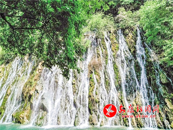 沿著木質(zhì)棧道前行,沒走多遠,耳中就傳來轟隆隆的水鳴聲,循聲望去,原來在大峽谷東南面的半山腰上有一掛巨大的瀑布。透過枝葉縫隙遙看瀑布的源頭,只見清清的泉水翻過一條石堰,從高高的崖壁口義無反顧地縱身飛躍而下,本是渾然一體的百米巨幅水簾,被凹凸不平的壁巖、樹枝、水草撕裂成形狀不一的一縷縷絹綢,千絲萬縷地交織著,撕扯著。細看,又猶如由萬千珍珠串起的珠簾,懸于半山腰間。瀑布四周彌漫著流云般的淡淡煙霞,初夏的陽光照耀著瀑布,折射出炫目的七彩光芒,形成一道道彩虹。粒粒珍珠流光溢彩、熠熠生輝。壁巖上嶙峋的怪石被水經(jīng)年累月地沖刷,早已失去了棱角,變得圓滑溫潤。因為潮濕的緣由,巖壁上鋪了一層厚厚的、碧綠的青苔,讓瀑布有了層次感,像極了妙手丹青繪制的巨幅山水壁畫,鮮活靈動。游人紛紛拿出手機,在此排隊拍照、攝影留念。因它位于峽谷門口,似是迎接各位游客,故得名“迎賓瀑”。想到前幾日,朋友圈有人曬出聞名古今的廬山瀑布,只剩下一縷細細的溪流,從上面無力地流瀉下來,似是隨時都有中斷的可能,哪里還有“飛流直下三千尺,疑是銀河落九天”的氣勢時,不由得對眼前的這掛瀑布更加喜愛。