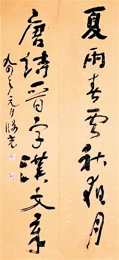 旸光先生淵博的家學(xué),深厚的學(xué)養(yǎng)為其書法技藝開掘出流淌不盡的源泉,正是他那非凡的經(jīng)歷與盤踞胸中的郁勃之氣,鑄就了別具一格的藝術(shù)風(fēng)采。縱觀先生書法字里行間的布局、結(jié)構(gòu)、章法,即可以領(lǐng)略其高深的藝術(shù)修養(yǎng)。一般書法家給自己作品題款尚膽怯,更何況給山水畫人物、花鳥畫題款署名,書寫跋語,要求書者不但有深厚的文學(xué)功底賦詞作詩,再根據(jù)畫面的風(fēng)格,畫中所留空白虛實照應(yīng),用筆用墨的變化去應(yīng)對,好的款跋使作品升華。而先生無論行、草、隸、篆,縱橫涂抹,信手拈來如行云流水,宛若天成,令人折服,先生曾為不少后學(xué)作品撰寫款名,跋語至今記憶猶新。