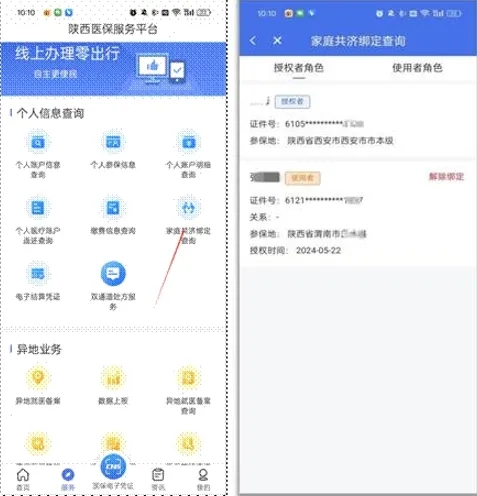 在“服務(wù)”菜單界面,點擊進(jìn)入“家庭共濟(jì)綁定查詢”頁面,可以查詢授權(quán)者和使用者的角色信息。
