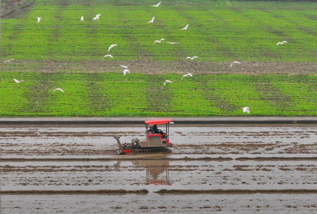 2月25日,在浙江省瑞安市馬嶼鎮(zhèn)儒陽(yáng)村,農(nóng)機(jī)在田間犁地,白鷺低空而飛(無(wú)人機(jī)照片)。早春時(shí)節(jié),各地農(nóng)民搶抓農(nóng)時(shí),開展春耕、春管等農(nóng)事活動(dòng),田間地頭到處是一派人勤春早的忙碌景象。 新華社發(fā)(蘇巧將攝)