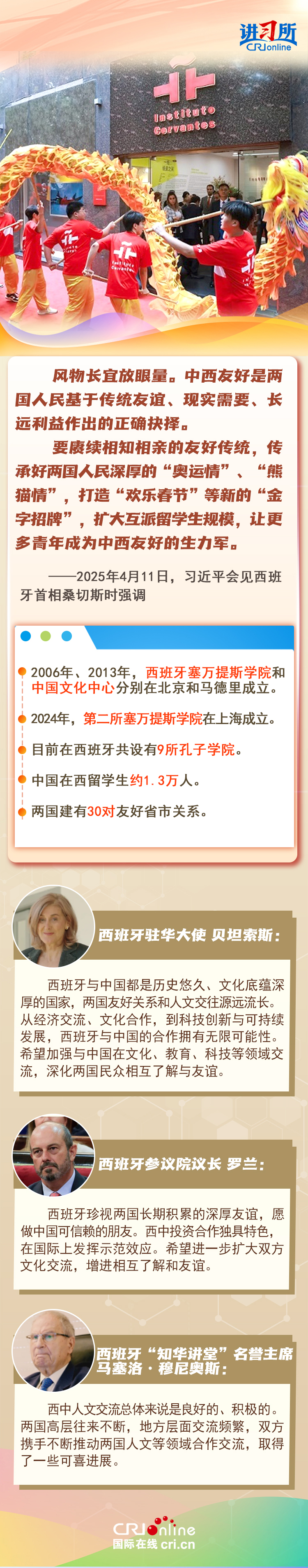 今年是中西全面戰(zhàn)略伙伴關(guān)系建立20周年,也是中歐建交50周年。多年來(lái),中西兩國(guó)領(lǐng)導(dǎo)人保持密切互動(dòng),秉持互尊互信、互利共贏精神,兩國(guó)在深化貿(mào)易、投資、科技創(chuàng)新、綠色能源等領(lǐng)域取得豐富合作成果,雙邊關(guān)系走在中國(guó)同歐洲國(guó)家關(guān)系前列。在西班牙人士眼中,良好的對(duì)華關(guān)系對(duì)西班牙、歐洲和世界具有重要意義,將會(huì)為兩國(guó)人民帶來(lái)更多實(shí)實(shí)在在的福祉,也將共同創(chuàng)造更美好的未來(lái)。