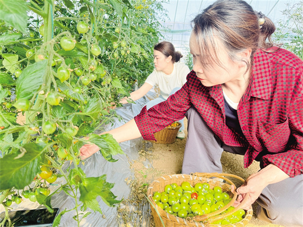 在分揀包裝區(qū),果農們將圣女果按顏色、甜度分級包裝?!扒嗌鸲雀撸m合鮮食;紅色果酸甜適中,主要供應餐飲店?!贝迕駝⒋蠼憬榻B,自己以前在外地務工,現在在家門口就能上班,每個月能掙3000多元。在歡樂采摘區(qū),游客們一邊采摘一邊拍照,發(fā)微信朋友圈展示觀光采摘的樂趣。