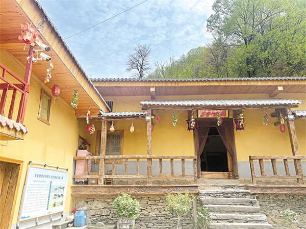 藍(lán)天、白云、清風(fēng)、朗日、松林……一切慵懶舒適得剛剛好。一路盤繞,繞道幾彎桃紅柳綠、野花盛開的山道,掠過桃紅李白郁郁蔥蔥的樹林,周家院子便毫無征兆地映入眼簾。隔墻遠(yuǎn)瞧,院內(nèi)房屋呈L形鋪展開來,房梁上懸掛的金黃色玉米穗、燦若紅霞的辣椒展示著農(nóng)家物產(chǎn)豐饒的鄉(xiāng)野特色,犁彎、犁脖、犁鏵,述說著院子主人的勤勞與殷實(shí)。而一串串醒目的大紅燈籠,展示著主人的幸福生活和對(duì)未來的美好憧憬。