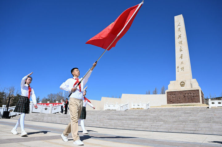 ? 這是2025年4月2日在內(nèi)蒙古呼和浩特市大青山紅色文化公園拍攝的中國少年先鋒隊出旗儀式。