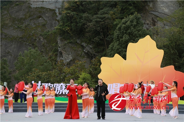 金秋時節(jié)的茨溝鎮(zhèn),萬畝紅葉、層林盡染。伴隨著歡快的鑼鼓聲,茨溝鎮(zhèn)、五里鎮(zhèn)、譚壩鎮(zhèn)三支隊伍輪番登場,不僅獻唱原創(chuàng)村歌,還展示特色產(chǎn)業(yè)、優(yōu)質(zhì)資源與地方文化,紛紛亮出獨具特色的“看家絕活兒”。歌伴舞《村歌飛揚》《松壩謠》《幸福歌兒唱起來》唱出了鄉(xiāng)親們的幸福生活;以修建八一水庫為背景的安康歌謠《我來了》引發(fā)會場共鳴;民俗表演《龍的傳人》則將節(jié)目推向高潮。舞蹈、鄉(xiāng)村T臺秀、民俗表演、八岔戲等節(jié)目,或以傳統(tǒng)幽默詼諧的風(fēng)格,或以深情敘述的方式,展現(xiàn)鄉(xiāng)村新生活,為觀眾獻上一場別開生面的視聽盛宴,現(xiàn)場歡呼聲此起彼伏。