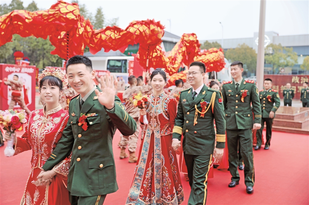 晨曦微露,新娘們身著秀禾,鬢邊珠釵搖曳;新郎們一身戎裝,身姿挺拔如松,雙方帶著滿心熾熱共同奔赴愛的殿堂。據(jù)了解,此次婚禮從籌劃之初便秉持“官兵滿意、家屬暖心”的原則,從住宿安排、婚車調(diào)度到場(chǎng)地布置、環(huán)節(jié)設(shè)計(jì),處處細(xì)致用心,雖然沒有奢華的排場(chǎng),卻處處彰顯著軍營(yíng)獨(dú)有的浪漫。