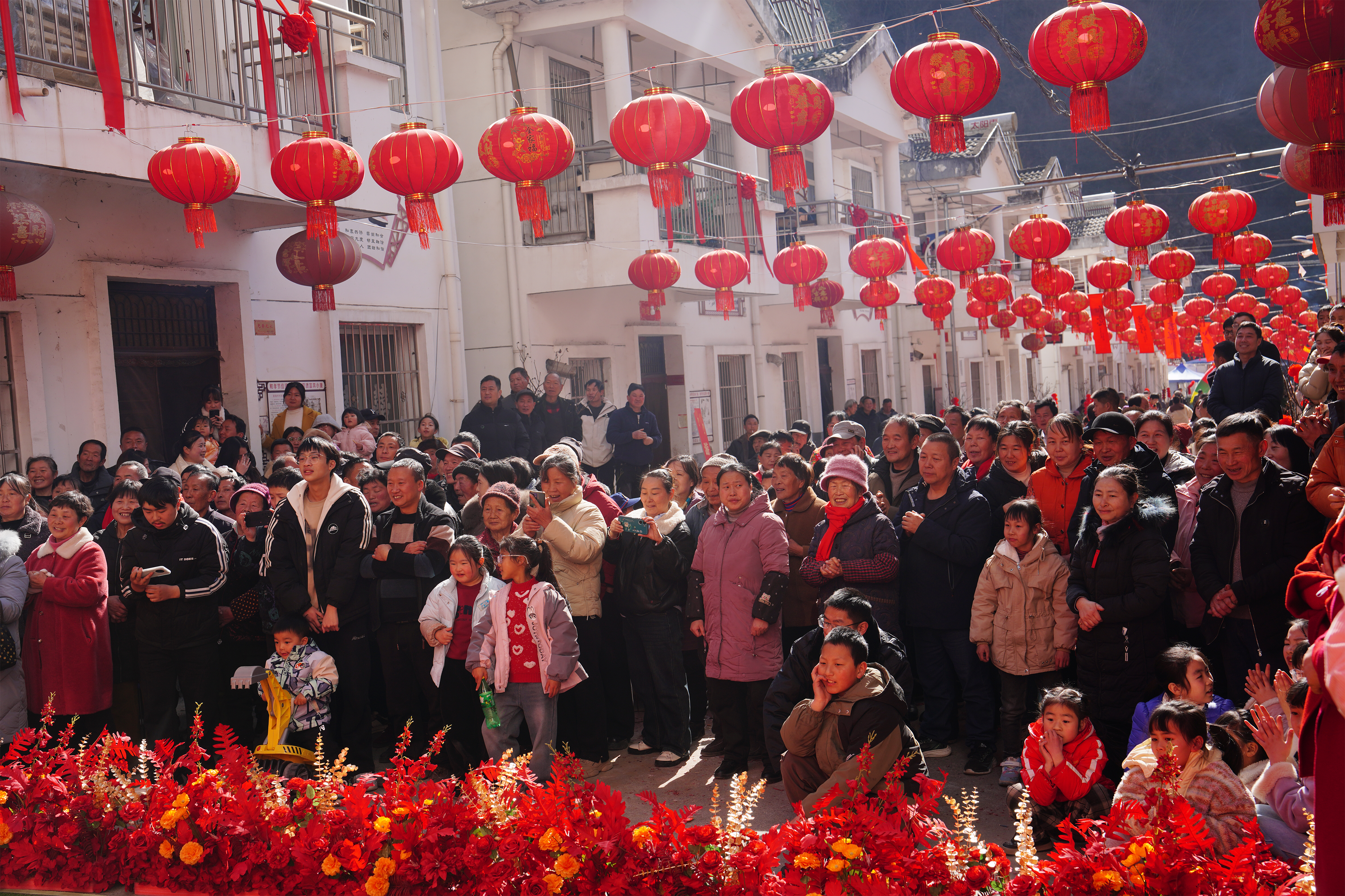 △ 2月2日,村民和游客觀看新場(chǎng)鎮(zhèn)“村晚”節(jié)目表演。