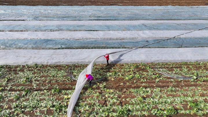 △2025年12月11日,山東東營廣饒縣,農(nóng)民為作物覆蓋防寒無紡布。
