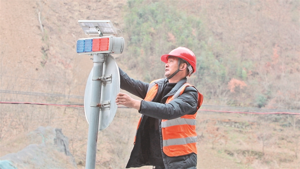 ⑧ 鎮(zhèn)坪公路段松坪養(yǎng)護中心的養(yǎng)護人員檢查護欄警示標志,確保群眾出行安全。屈光波 攝