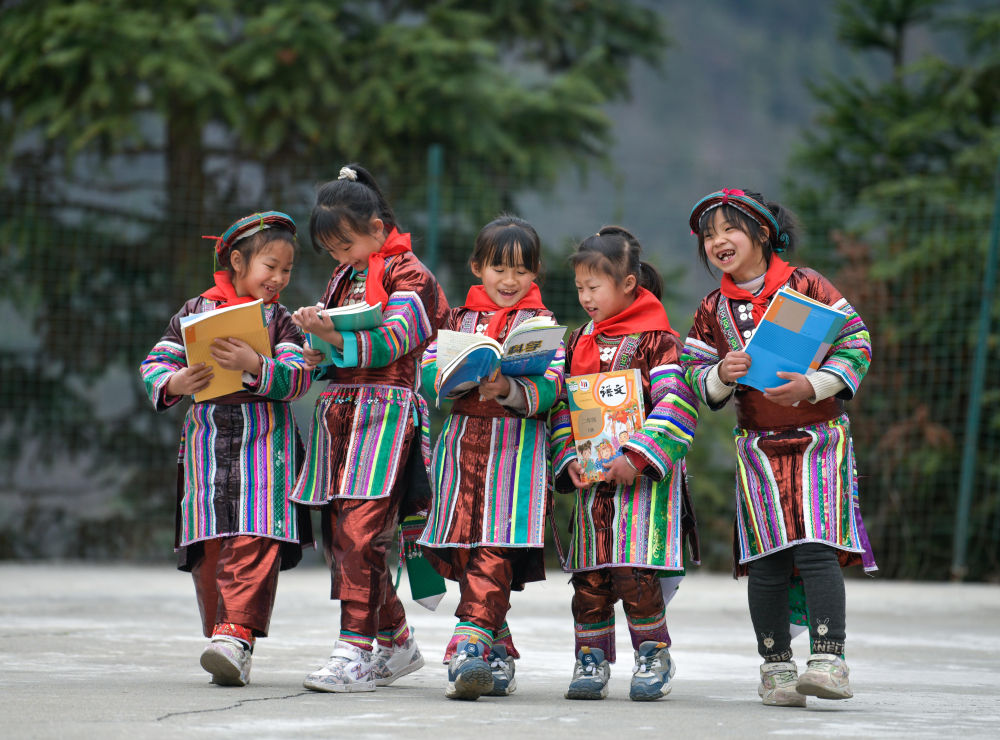 2023年2月16日,在貴州省從江縣西山鎮(zhèn)中寨教學(xué)點,領(lǐng)到新書的瑤族學(xué)生在一起交流。新華社記者楊文斌攝