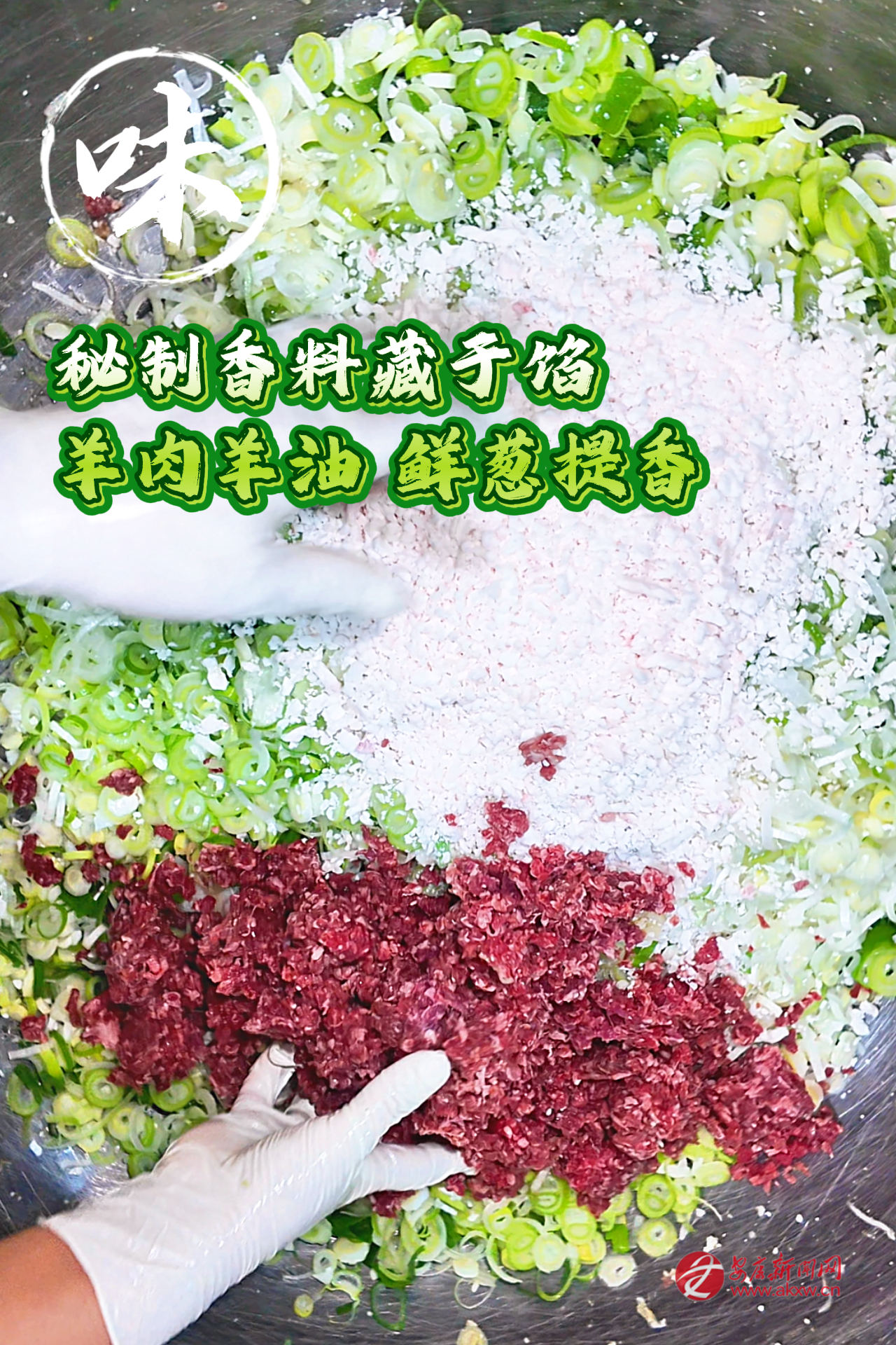 再是做油酥。抓一把面粉,擱碗里,加鹽、五香粉,用滾沸的熟油潑進(jìn)去,筷子急急地?cái)嚒D敲嬖谟屠飭陠甑仨?,漸漸融成濃稠的一團(tuán)。這油酥,是餅子起層的秘密。還有餡料。羊肉選用本地的羊,肉切成小小的丁。太肥了不行,須得瘦肉多一些,得加些羊脂丁,那樣煎出來(lái)才潤(rùn),才有汁水。蔥花要多,要本地的蔥,切得碎碎的,拌上鹽、花椒粉、五香粉。有的還加焙香的苜蓿末,黃黃的,有股子清野的氣味。