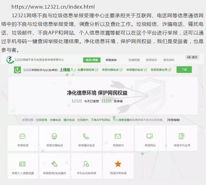 12321網(wǎng)絡不良與垃圾信息舉報受理中心主要承擔關(guān)于互聯(lián)網(wǎng)、電話網(wǎng)等信息通信網(wǎng)絡中的不良與垃圾信息舉報受理、調(diào)查分析以及查處工作。垃圾短信、詐騙電話、騷擾電話、垃圾郵件、不良APP和網(wǎng)站、個人信息泄露等都可以在這個平臺進行舉報,還可以通過手機號碼一鍵查詢舉報處理結(jié)果。凈化信息環(huán)境,保護網(wǎng)民權(quán)益,我們是受益者,也是參與者。